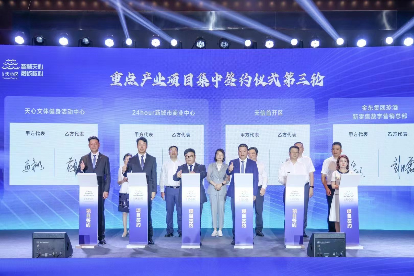 會場上,湘商代表共聚一堂,“招商顧問”紛紛上臺,推介天心、宣傳天心;“四新經濟示范企業”授牌,12個重點招商項目簽約,總投資額近100億元,其中包括天心文投與我司共同布局區域體育消費新賽道—天心區文體活動中心項目。
